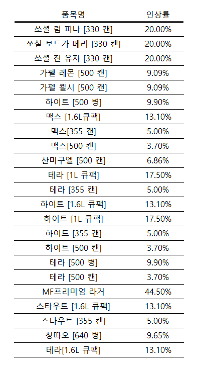 ※ 각 수입사/ 도매장 및 매장 여건에 따라 인상시점 및 인상율이 변동될 수 있습니다.